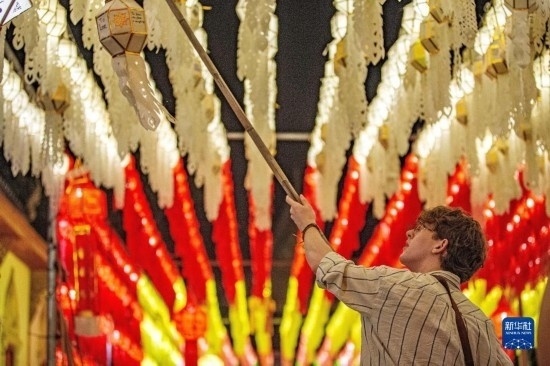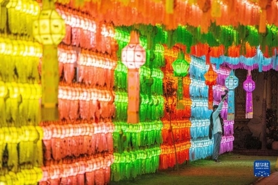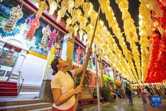 11月23日,游客在泰國南奔府哈利奔猜寺懸掛燈籠。