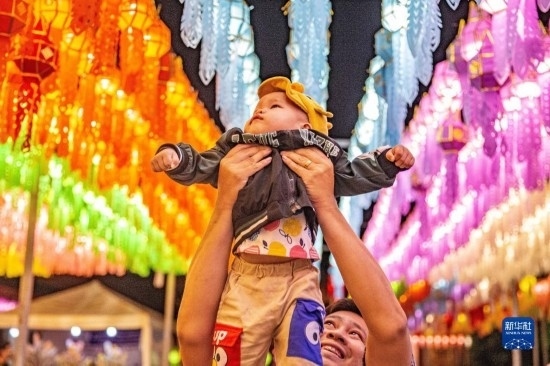 11月23日,在泰國南奔府哈利奔猜寺,一名男子舉著孩子觀賞燈籠。