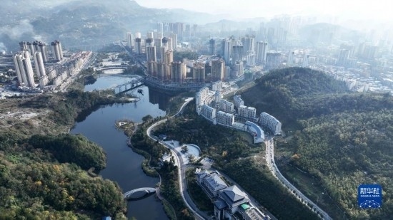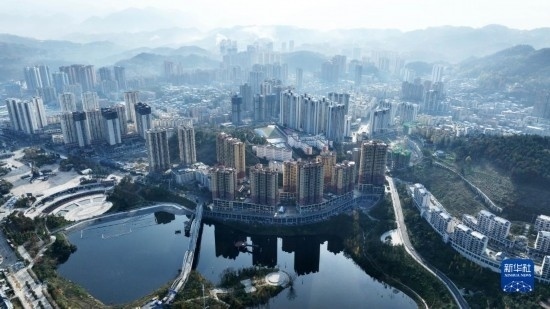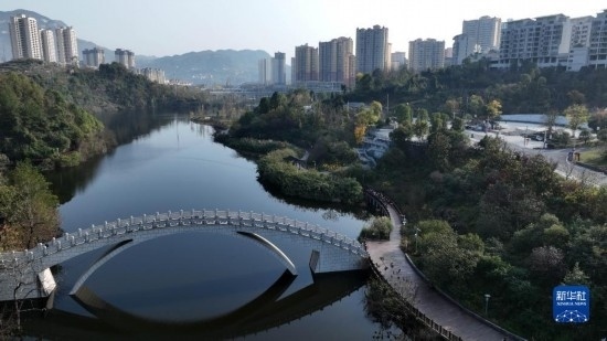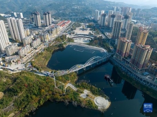 11月29日拍攝的貴州省遵義市正安縣濕地公園與民居一景(無人機照片)。