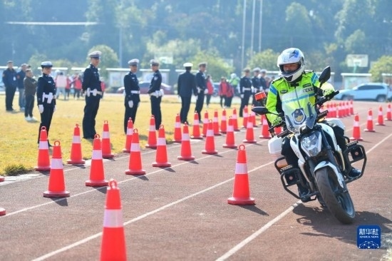 12月1日,在長沙市望城區(qū)新河學校,長沙市公安局望城分局交警大隊的鐵騎隊員進行技能展示。