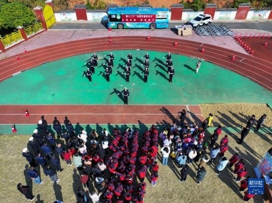 12月1日,在長沙市望城區(qū)新河學校,學生觀看交警手勢演示(無人機照片)。