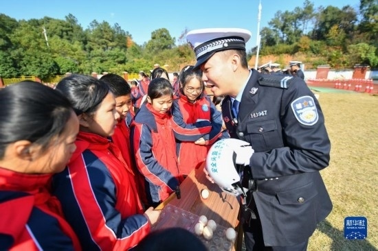 12月1日,在長沙市望城區(qū)新河學校,學生觀看交警手勢演示。
