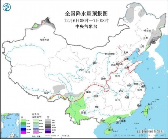 全國(guó)降水量預(yù)報(bào)圖(12月6日08時(shí)-7日08時(shí))