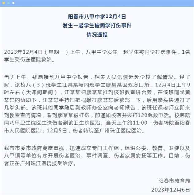 ·廣東陽春一中學生疑被同學打成植物人?官方通報:成立專門工作組。