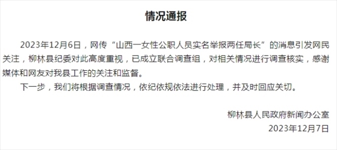 ·山西女子實名舉報兩任局長受賄玩弄女性,柳林縣紀委:已經成立聯合調查組。