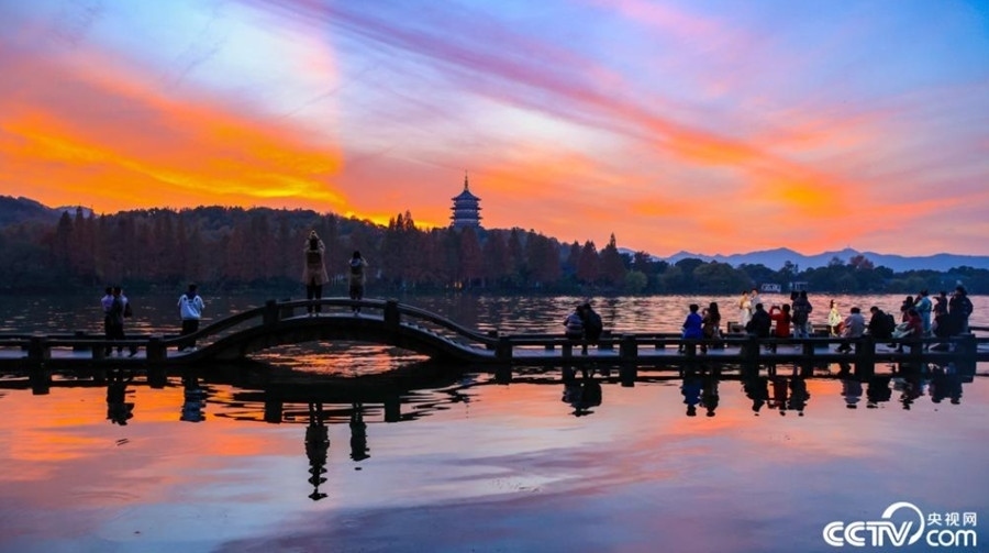 夕陽西下,在杭州西湖景區(qū),晚霞染紅了天空和水面,與遠處的雷峰塔構成了一幅美麗的畫卷,吸引游客拍照打卡。