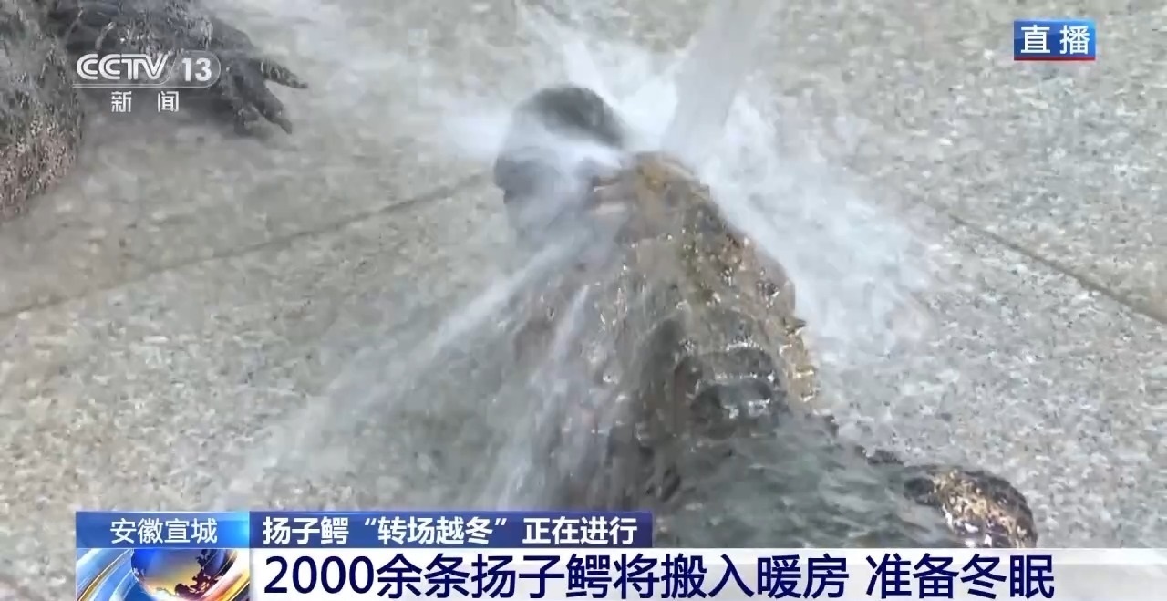 由于今年的溫度比較高,與往年相比,轉(zhuǎn)場(chǎng)越冬推遲了十天左右。轉(zhuǎn)場(chǎng)是按照從小到大的順序。今天是第一天,率先搬家的主要是7歲以下的幼鱷,它們對(duì)環(huán)境的適應(yīng)能力更弱一些,需要盡快搬進(jìn)室內(nèi)。在搬進(jìn)暖房之前,揚(yáng)子鱷需要先進(jìn)行沖洗、消毒?!鞍布摇焙?,越冬房的溫度會(huì)保持在10℃左右,并且有工作人員定期打掃、保濕,確保揚(yáng)子鱷安全過(guò)冬。