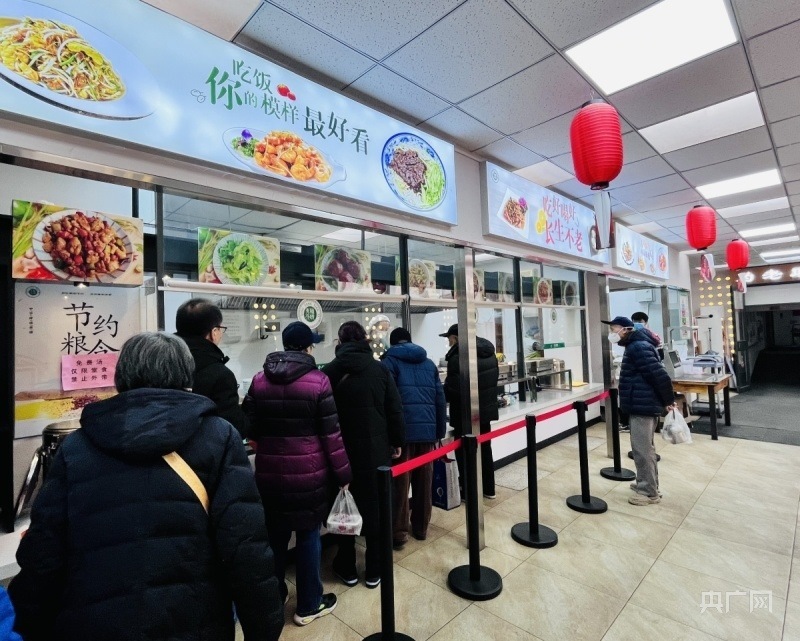 天津市和平區(qū)南營門街道老人家食堂內(nèi),老人們排隊(duì)就餐(央廣網(wǎng)記者 褚夫晴 攝)