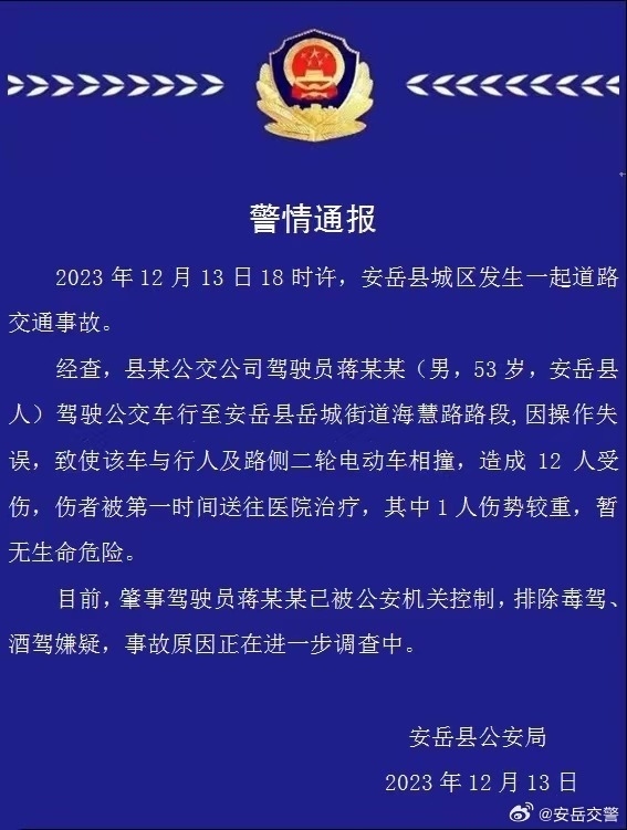 ·四川安岳一公交車中學(xué)門口撞倒多名學(xué)生,警方通報(bào):12人受傷。