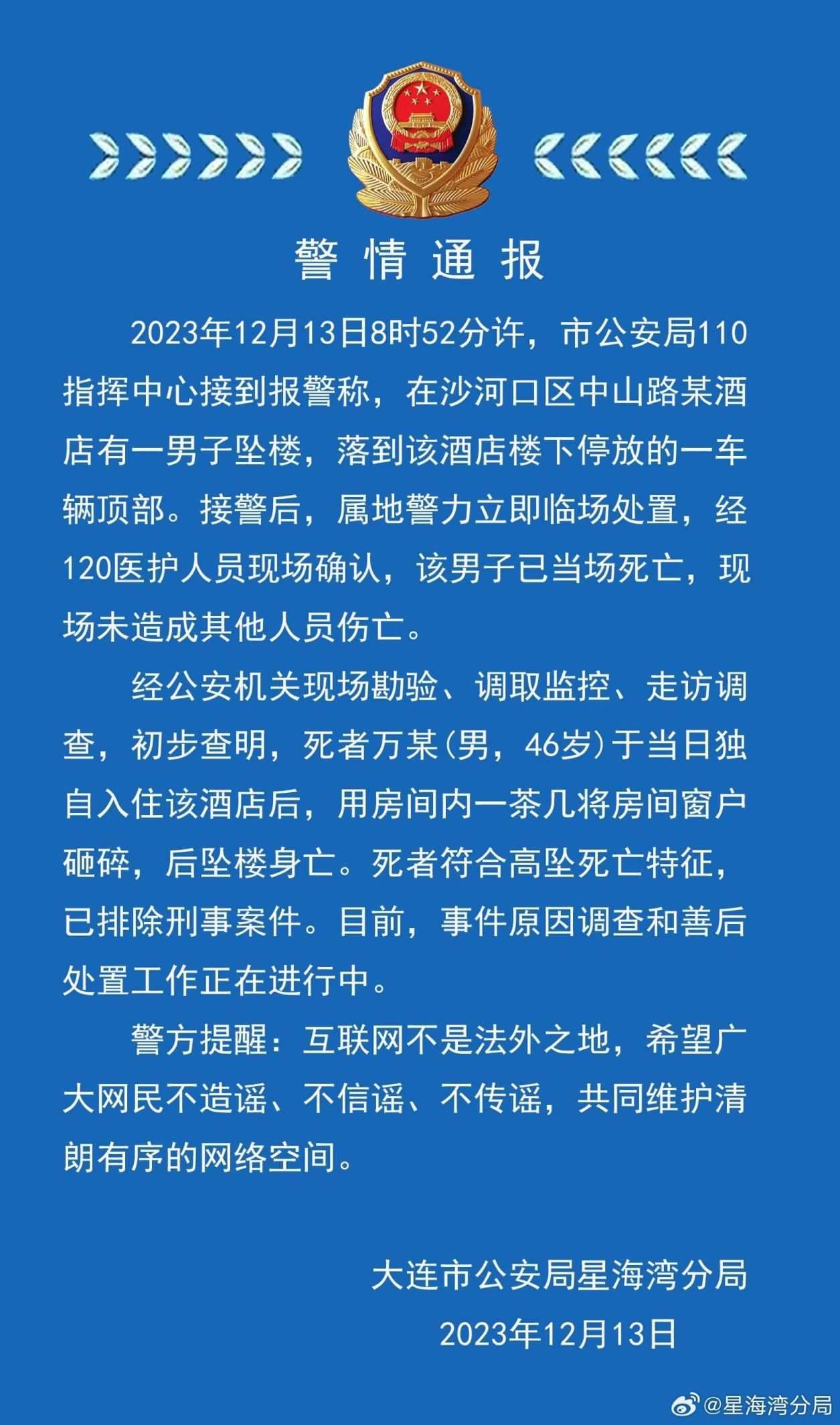 ·警方通報(bào)大連一酒店男子墜樓身亡:46歲男子用茶幾砸碎窗戶,排除刑案、