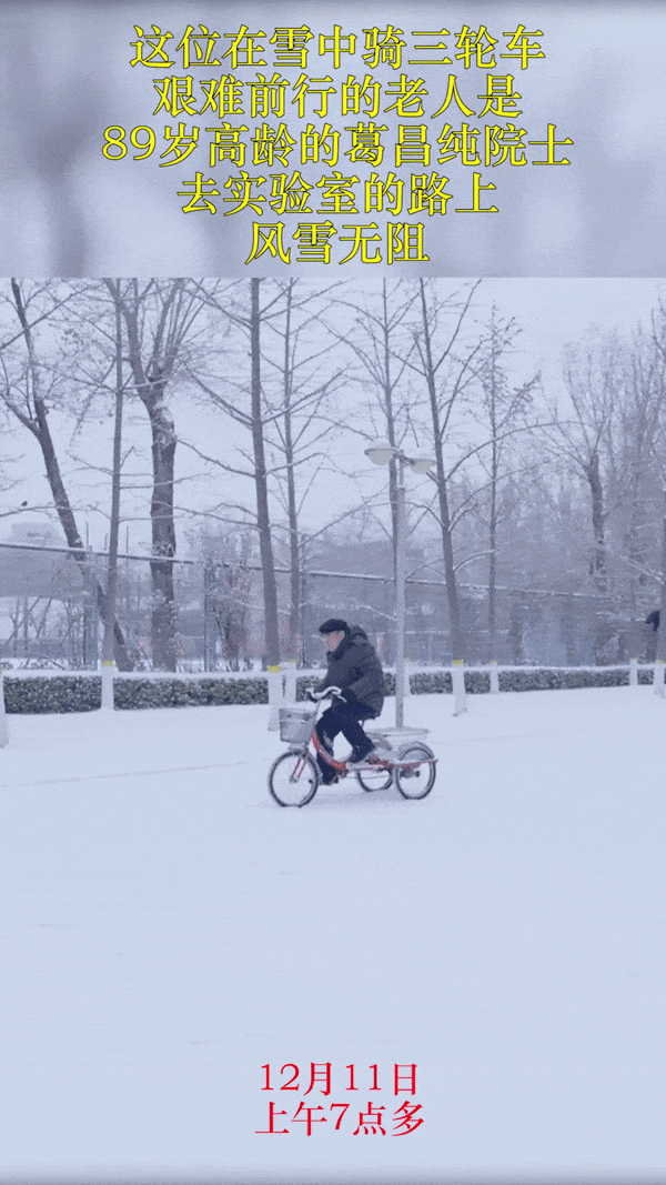 近日,早上7點(diǎn)多,北京降雪后,在北京科技大學(xué)的校園內(nèi),拍到感人一幕。茫茫白雪中,一位老人吃力地蹬著三輪車緩緩地前進(jìn),風(fēng)雪無阻。老人是89歲的葛昌純?cè)菏浚@天早晨,他正騎車前往實(shí)驗(yàn)室,而騎著三輪車去實(shí)驗(yàn)室,是葛老幾十年如一日的堅(jiān)持。葛昌純?cè)菏渴侵瞬牧稀⒎勰┮苯鹨约跋冗M(jìn)陶瓷專家,是我國(guó)“核工業(yè)功勛”人物,為“兩彈一星”事業(yè)作出了重要貢獻(xiàn)。