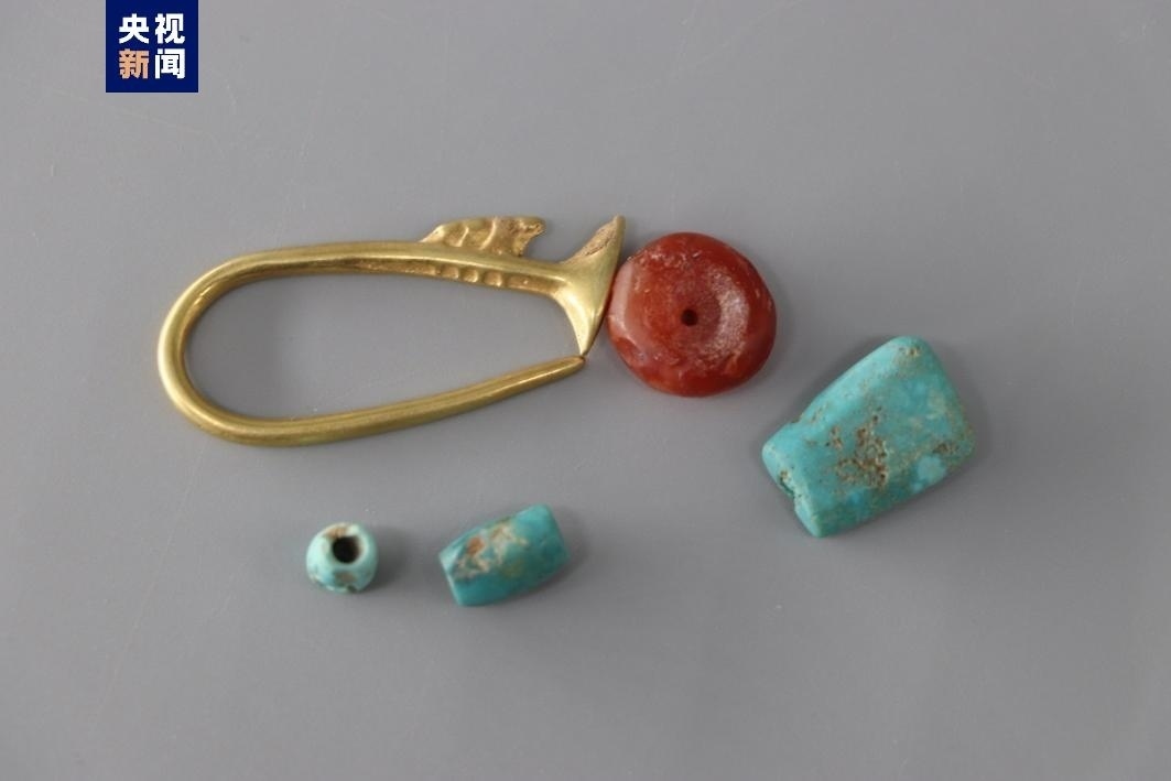 △金耳飾、綠松石串珠、紅瑪瑙珠