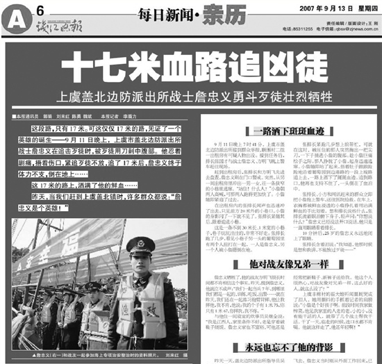 “這段路,只有17米??蛇@僅僅17米的路,見(jiàn)證了一個(gè)英雄的誕生——9月11日晚上,上虞市蓋北邊防派出所戰(zhàn)士詹忠義在追擊歹徒時(shí),被歹徒用刀刺中腹部。他忍著劇痛,捂著傷口,緊追歹徒不放,追了17米后,詹忠義終于體力不支,倒在地上……這17米的路上,灑滿了他的鮮血……”