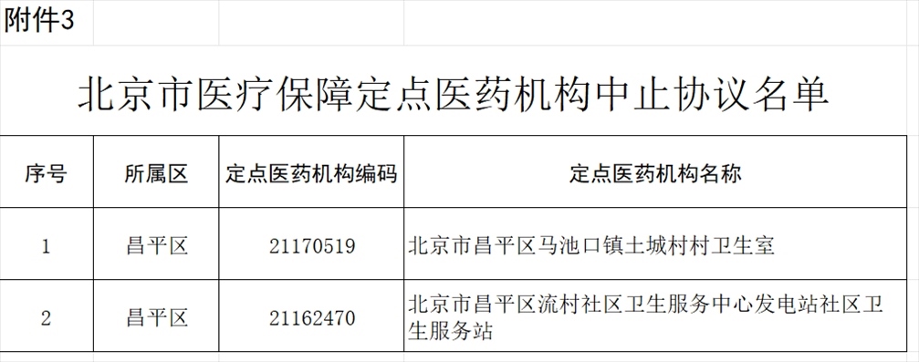 北京市昌平區(qū)馬池口鎮(zhèn)土城村村衛(wèi)生室等2家定點醫(yī)藥機(jī)構(gòu)因不能繼續(xù)為參保人員提供服務(wù),申請中止協(xié)議,經(jīng)市、區(qū)醫(yī)保經(jīng)辦機(jī)構(gòu)審核,現(xiàn)決定對上述2家定點醫(yī)藥機(jī)構(gòu)中止協(xié)議(見附件3)。