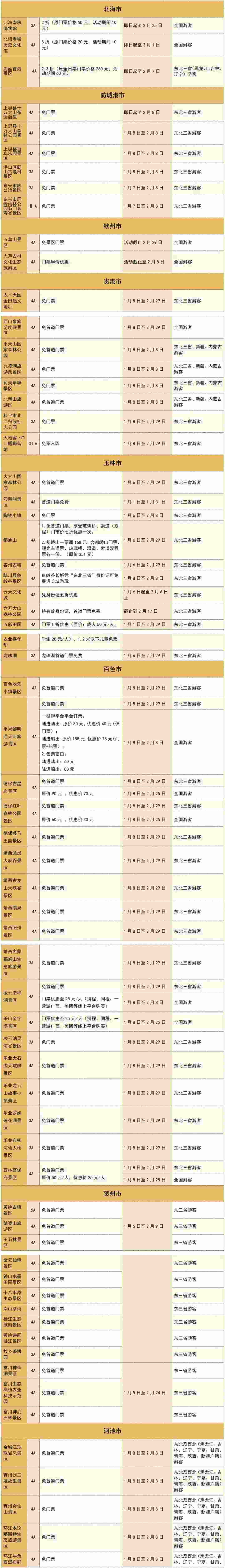 柳州程陽八寨景區(qū)、桂林桂海晴嵐、百色靖西通靈大峽谷景區(qū)、百色樂業(yè)大石圍天坑群景區(qū)、賀州黃姚古鎮(zhèn)景區(qū)、河池羅城棉花天坑度假區(qū)、崇左德天跨國瀑布景區(qū)、崇左大新縣明仕景區(qū)、崇左左江花山巖畫景區(qū)等等,近兩百家廣西景區(qū)面向東北“老鐵”推出免門票或打折優(yōu)惠政策!此外,還有多家景區(qū)面向全國游客推出優(yōu)惠政策!