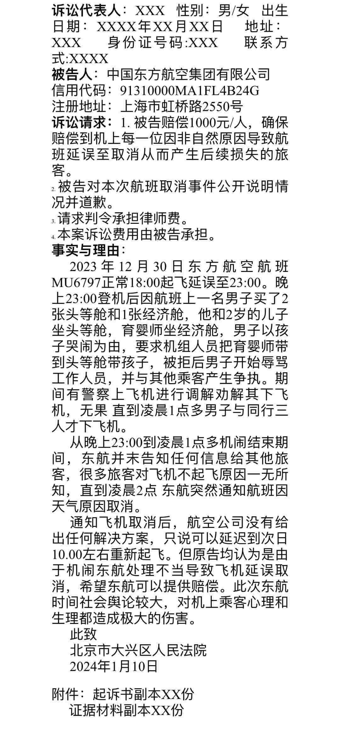 群內(nèi)發(fā)出的起訴書寫道:“從當日23點到次日凌晨1點多機鬧結束期間,東航并未告知任何信息給其他旅客,很多旅客對飛機不起飛原因一無所知,直到凌晨2點,東航突然通知航班因天氣原因取消。通知飛機取消后,航空公司沒有給出任何解決方案,只說可以延遲到次日10點左右重新起飛。但原告均認為是由于機鬧,東航處理不當,導致飛機延誤取消,希望東航可以提供賠償。此次東航事件社會輿論較大,對機上乘客心理和生理都造成極大的傷害。”據(jù)悉,乘客們擬起訴至北京市大興區(qū)人民法院。