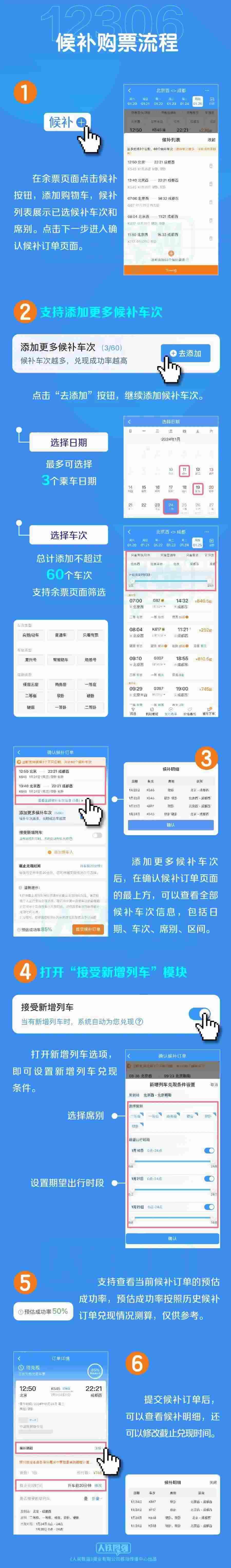 為提升旅客購(gòu)票體驗(yàn),鐵路部門加大研發(fā)力度,對(duì)鐵路12306候補(bǔ)購(gòu)票功能進(jìn)行了優(yōu)化升級(jí)。一是增加候補(bǔ)訂單數(shù)量。每名旅客可提交的待兌現(xiàn)候補(bǔ)訂單數(shù)量由2個(gè)增至6個(gè),每個(gè)訂單最多可添加9名乘車人。二是增加備選方案數(shù)量。原來(lái)旅客提交候補(bǔ)訂單時(shí),可選擇相鄰2個(gè)乘車日期、每個(gè)日期可選擇5個(gè)“車次+席別”的組合,最多可選擇10個(gè)組合。優(yōu)化升級(jí)后,旅客可選擇預(yù)售期內(nèi)任意3個(gè)乘車日期,累計(jì)最多可選擇60個(gè)“日期+車次”的組合,每個(gè)車次可選多個(gè)席別。三是擴(kuò)大候補(bǔ)訂單兌現(xiàn)時(shí)間選擇范圍。原來(lái)候補(bǔ)訂單截止兌現(xiàn)時(shí)間最晚為開車前2小時(shí),優(yōu)化升級(jí)后調(diào)整為開車前20分鐘,旅客可在更大范圍內(nèi)根據(jù)實(shí)際情況自主選擇修改截止兌現(xiàn)時(shí)間。四是臨時(shí)新增旅客列車席位優(yōu)先配售給已提交候補(bǔ)訂單的旅客。旅客在提交候補(bǔ)訂單時(shí),可選擇接受購(gòu)買符合出行需求的新增旅客列車車票,如鐵路部門臨時(shí)新增旅客列車,在車票起售時(shí),鐵路12306將自動(dòng)優(yōu)先配售給已提交候補(bǔ)訂單的旅客,旅客無(wú)需人工查詢?cè)鲩_列車信息再購(gòu)票。