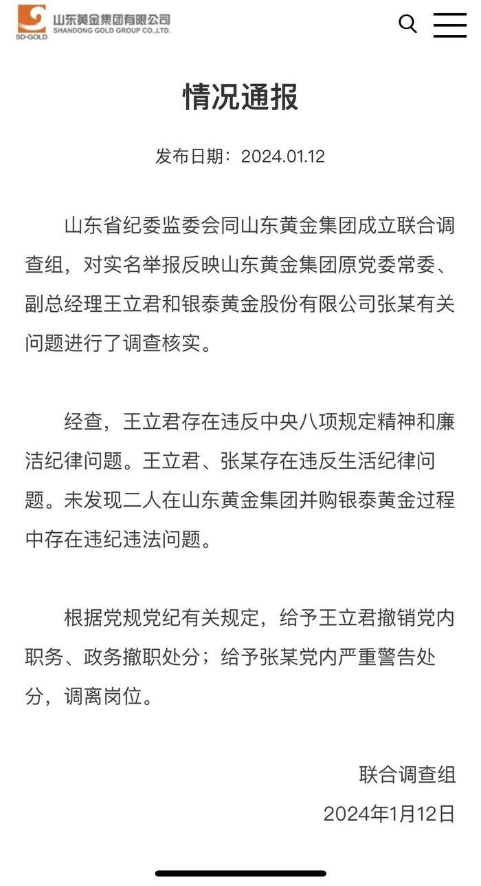 ·山東黃金集團通報男子舉報妻子出軌國企領導:給予王立君撤銷黨內職務、政務撤職處分。