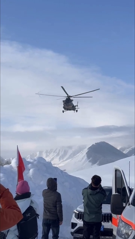 1月16日,新疆軍區(qū)某陸航旅運(yùn)送緊急物資的直升機(jī)飛往禾木村。再帕爾·木拉曼/攝