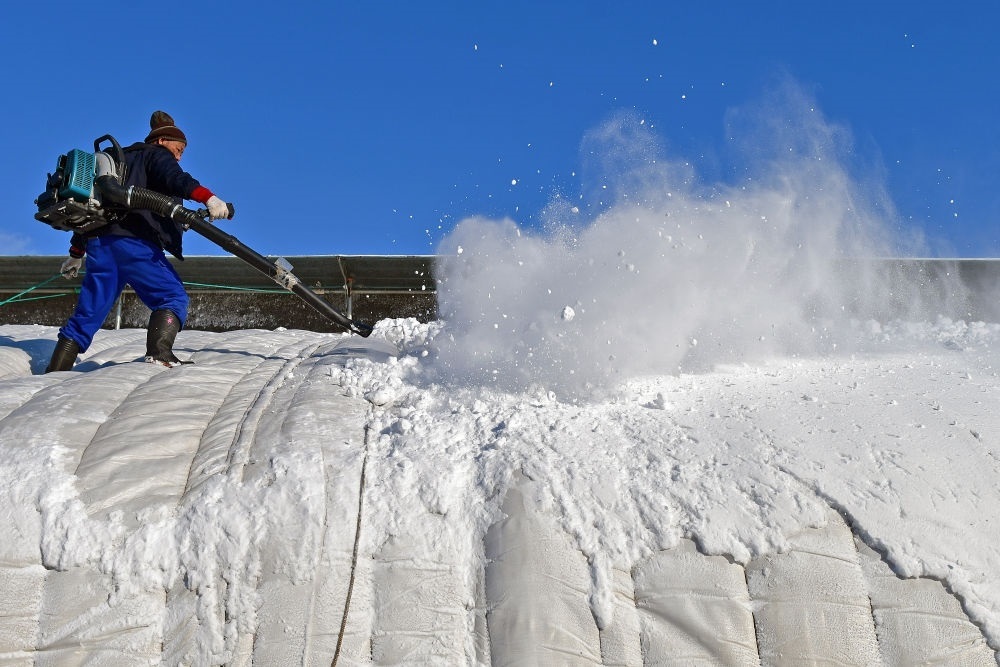 2023年12月17日,農(nóng)民在山東省煙臺(tái)市福山區(qū)門樓街道用鼓風(fēng)機(jī)清理暖棚上的積雪。新華社發(fā)(孫文潭攝)