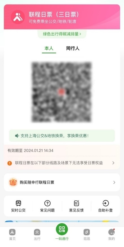 即日起,市民登錄上海市綠色出行一體化平臺(tái)“隨申行”APP,購(gòu)買并啟用“聯(lián)程日票”,即可在有效時(shí)間內(nèi)不限次乘坐上海地鐵、公交和輪渡。老人、小孩同行時(shí),支持為同行人購(gòu)買聯(lián)程日票。