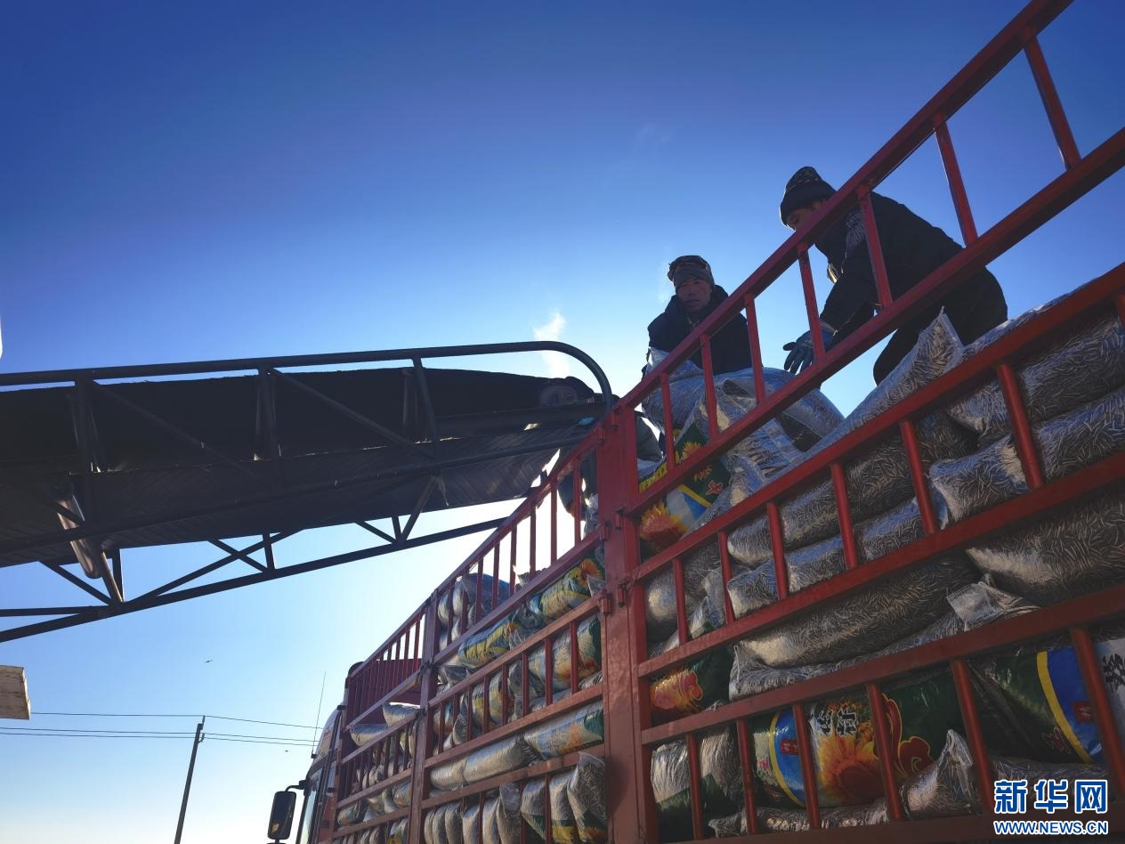 ??1月26日,內(nèi)蒙古包頭市固陽(yáng)縣紅泥井村糧油交易綜合市場(chǎng)內(nèi),工人們正在裝配葵花籽。新華網(wǎng)郝芳芳攝