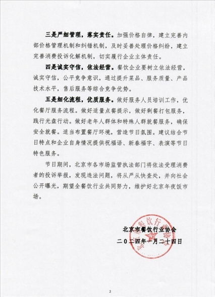 央視網(wǎng)消息:據(jù)北京市餐飲行業(yè)協(xié)會(huì)公眾號(hào)消息,據(jù)為進(jìn)一步規(guī)范北京年夜飯市場(chǎng)秩序,營(yíng)造首都良好節(jié)日餐飲消費(fèi)環(huán)境,保障消費(fèi)者合法權(quán)益,讓廣大市民體驗(yàn)到優(yōu)質(zhì)的年夜飯服務(wù)。同時(shí),更好地杜絕虛假價(jià)格、價(jià)質(zhì)不符、不合理定價(jià)、不合規(guī)收費(fèi)等不規(guī)范行為,北京市餐飲行業(yè)協(xié)會(huì)特發(fā)布如下倡議: