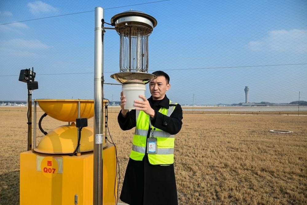 在成都天府國際機(jī)場,飛行區(qū)管理中心生態(tài)圍界管理室主管劉泰杉在維護(hù)驅(qū)鳥設(shè)施。(受訪者供圖)