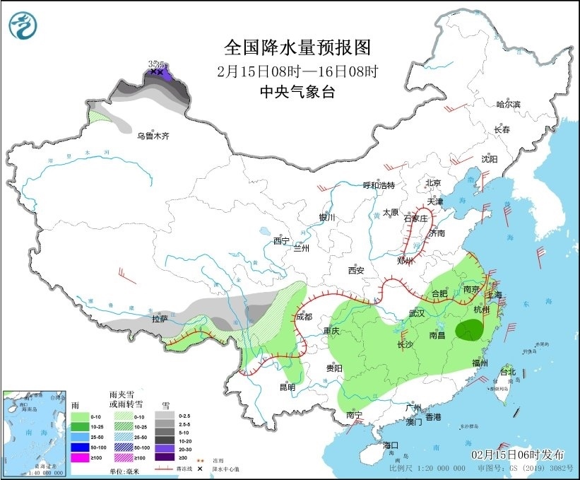 2月15日08時至16日08時,新疆北部、西藏東部和南部、川西高原中北部等地部分地區(qū)有小到中雪或雨夾雪,其中,新疆阿勒泰地區(qū)有大到暴雪,部分地區(qū)有大暴雪,局地特大暴雪(30~35毫米)。江淮大部、江漢東部、江南、西南地區(qū)東部、華南西部等地部分地區(qū)有小到中雨。西藏中部、內蒙古大部、遼寧西部、遼東半島、山東半島、江蘇南部、上海、湖南中北部等地部分地區(qū)有4~6級風,其中,浙江中東部部分地區(qū)有6~7級風;黃海大部海域、東海大部海域、臺灣海峽有7~8級、陣風9級的大風(見圖3)。