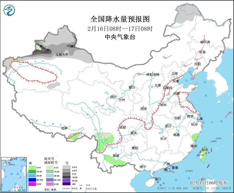 圖3 全國降水量預報圖(2月15日08時-16日08時)