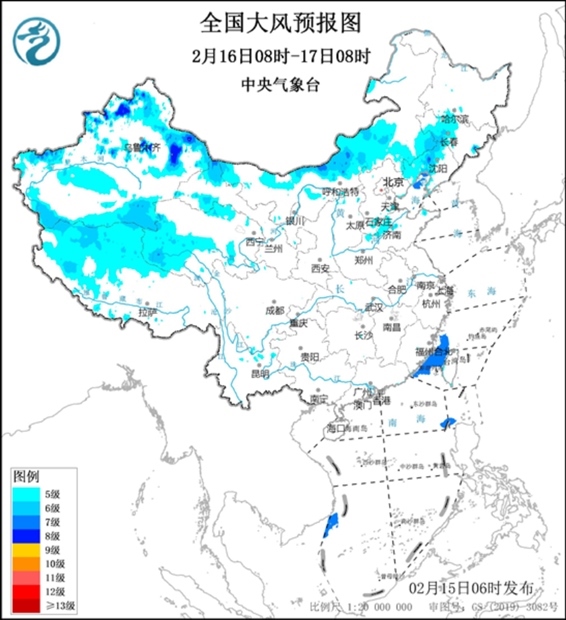 圖1 全國大風預報圖(2月15日08時-16日08時)