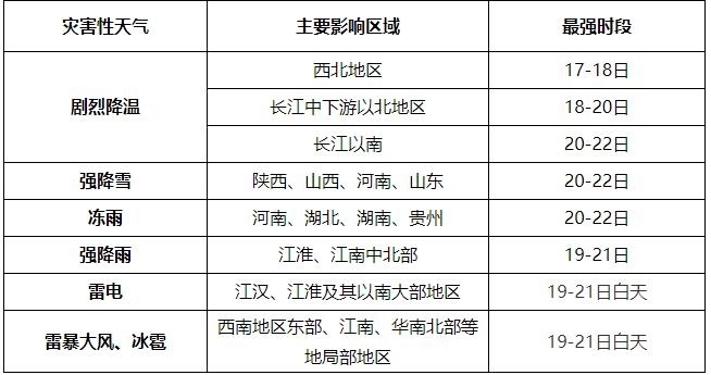 央視網(wǎng)消息:中央氣象臺(tái)預(yù)計(jì),2月17日至22日寒潮天氣將影響我國(guó),中東部地區(qū)氣溫起伏劇烈,大部地區(qū)降溫10~18℃,局地氣溫降幅可達(dá)20℃以上;全國(guó)大部有明顯雨雪天氣,其中陜西、山西、河南、山東等地有暴雪,局地大暴雪;河南、湖北、湖南、貴州將先后出現(xiàn)凍雨;江淮、江南中北部局地有暴雨,南方地區(qū)有大范圍雷電和局地強(qiáng)對(duì)流天氣。