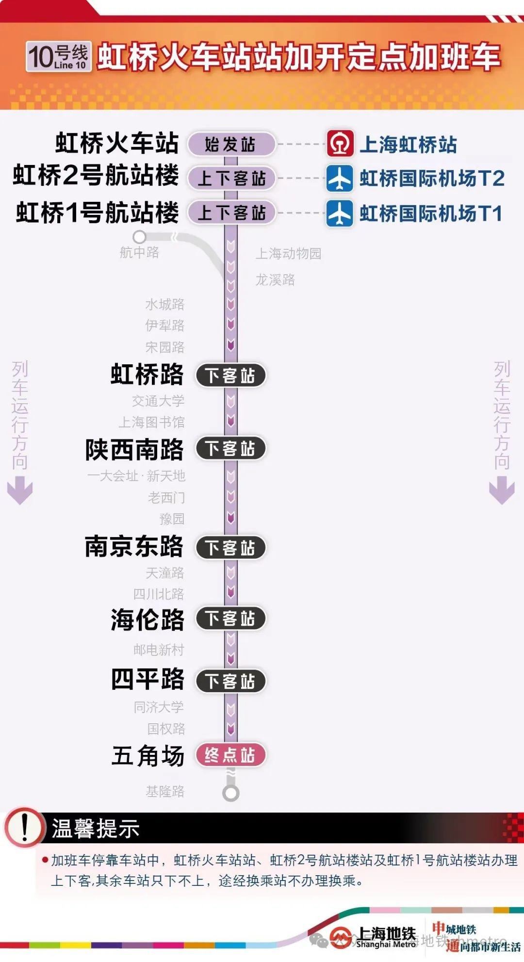 今日,10號(hào)線虹橋火車站加班車延長(zhǎng)至2月18日2:30。其中,10號(hào)線虹橋火車站站往五角場(chǎng)站方向定點(diǎn)加班車沿途僅??亢鐦蚧疖囌菊?、虹橋2號(hào)航站樓站、虹橋1號(hào)航站樓站、虹橋路站、陜西南路站、南京東路站、海倫路站、四平路站、五角場(chǎng)站,其余車站跳停。停靠車站中,虹橋火車站站、虹橋2號(hào)航站樓站、虹橋1號(hào)航站樓站可同時(shí)上下客,其余車站只下不上,途經(jīng)換乘站不可換乘。