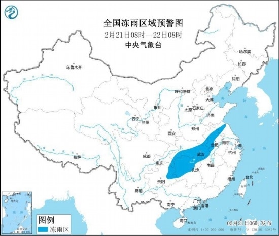 全國(guó)凍雨區(qū)域預(yù)警圖(2月21日8時(shí)-22日8時(shí))