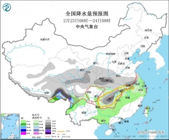 全國(guó)降水量預(yù)報(bào)圖(2月23日8時(shí)-24日8時(shí))