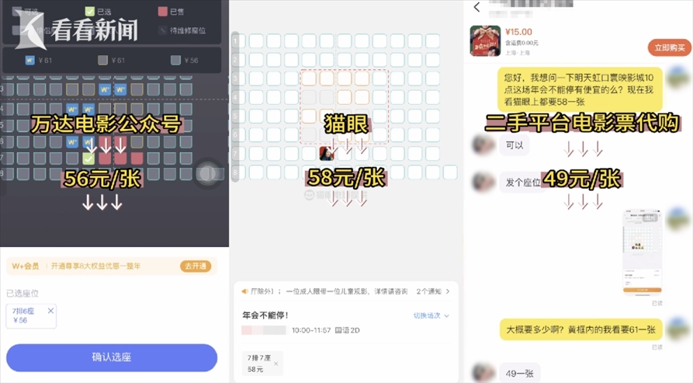 為了求證這一說法,記者來到了網友爆料的這家電影院,并提前通過三種渠道在線上購入了同天、同電影院、同場次、同排位置的三張電影票,分別花費了56元、58元、49元。