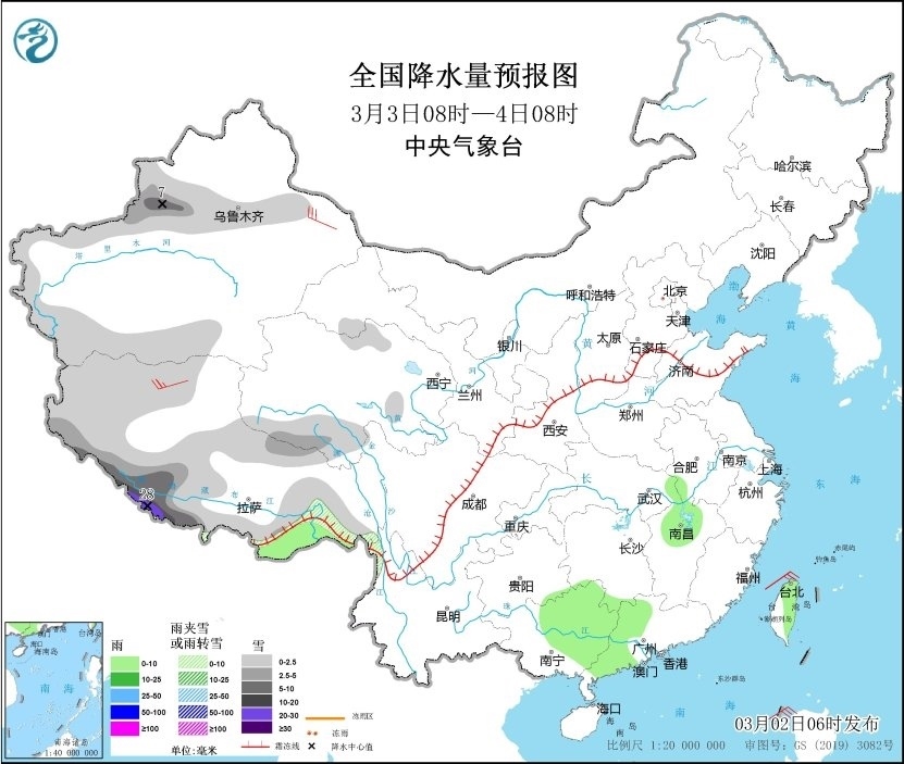 3月3日08時(shí)至4日08時(shí),新疆南疆西部山區(qū)、伊犁河谷和沿天山地區(qū)、西藏大部、青海南部等地部分地區(qū)有小到中雪或雨夾雪,其中,新疆伊犁河谷、西藏西南部等地部分地區(qū)有大到暴雪,局地大暴雪(20~28毫米)。西藏東南部、湖北東部、湖南南部、江西北部、廣西中東部、廣東中西部、臺(tái)灣島大部等地部分地區(qū)有小雨。新疆東部、西藏等地有4~6級(jí)風(fēng)(見(jiàn)圖2)。黃海南部、東海中北部、臺(tái)灣海峽、南海北部、北部灣等地有4~5級(jí)風(fēng),陣風(fēng)6級(jí)。