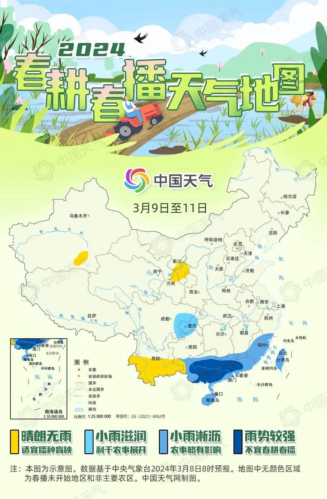 “微雨眾卉新,一雷驚蟄始。田家?guī)兹臻e,耕種從此起?!钡搅梭@蟄時節(jié),我國春耕春播工作已陸續(xù)展開,從華南到西北,田間地頭逐漸忙碌了起來。一年之計在于春,春耕春播工作對于全年糧食豐收至關(guān)重要。中國天氣網(wǎng)推出2024全國春播進(jìn)程圖和春耕春播天氣地圖,看各地春播何時展開,近期春播天氣如何。