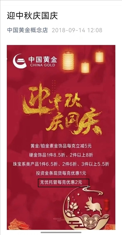 2018年,涉事門(mén)店的公眾號(hào)仍在宣傳無(wú)憂托管業(yè)務(wù),消費(fèi)者質(zhì)疑中國(guó)黃金方面,為何沒(méi)有發(fā)現(xiàn)這家店經(jīng)營(yíng)公司禁止的業(yè)務(wù)/受訪者供圖