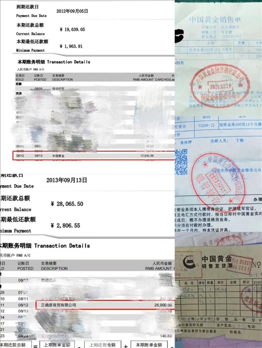 王鑫民:09年時(shí)候,他們跟順義那邊就有一個(gè)中國(guó)黃金店,就賣投資的黃金。我們想說(shuō)買點(diǎn),將來(lái)自個(gè)老了以后能有一保證。他說(shuō),你要能寄存到這兒,還能給你點(diǎn)小禮品,我們想挺好的,你擱家多不安全,這么貴重的東西,我們就擱他那了,他給我們開(kāi)單子。后來(lái),順義這店搬到雙井去了,這是中國(guó)黃金的,而且商場(chǎng)更大,誰(shuí)不都得放心。我們想跟他們也熟了,每年有點(diǎn)兒錢(qián)就買一點(diǎn)兒,還安全,還有點(diǎn)小獎(jiǎng)品,左一回買右一回買的,他店員都認(rèn)得我們了,挺熟的。他突然給我們打電話說(shuō):這出事了,你們趕緊過(guò)來(lái)。