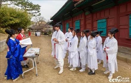 當(dāng)?shù)貢r間2024年3月16日,韓國首爾,成均館大學(xué)的新生們穿著儒生服,參加一年一度的迎新禮。