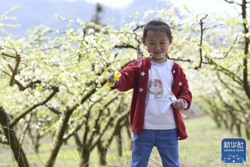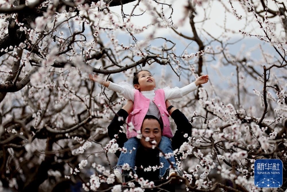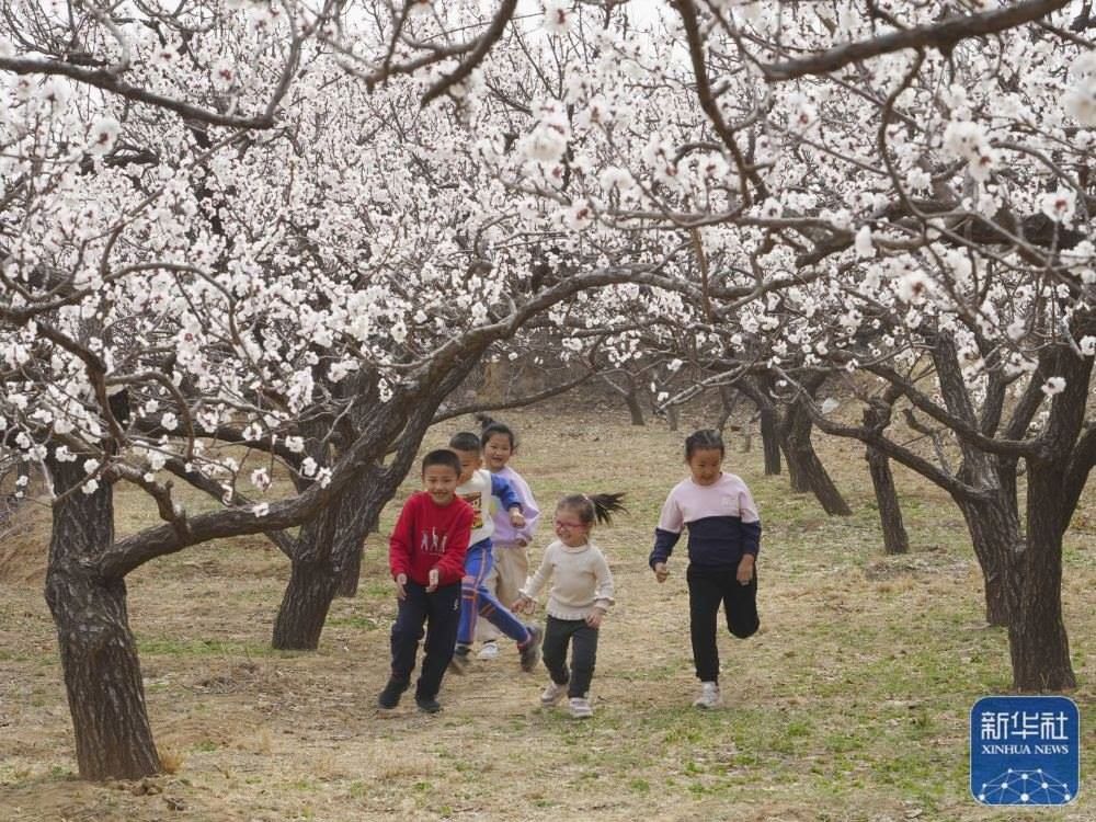 3月23日,小朋友在河北省石家莊市鹿泉區(qū)山南張莊村的杏林中玩耍。新華社發(fā)(閆志國攝)