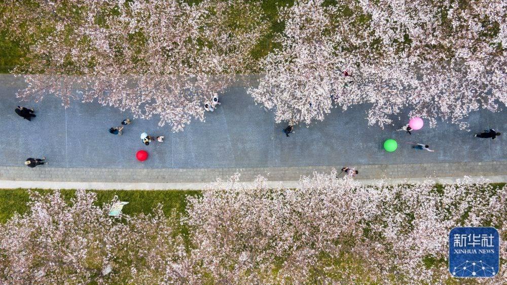 3月23日,游人在浙江省金華市國際友城公園櫻花大道上賞景游玩(無人機(jī)照片)。新華社發(fā)(胡肖飛攝)