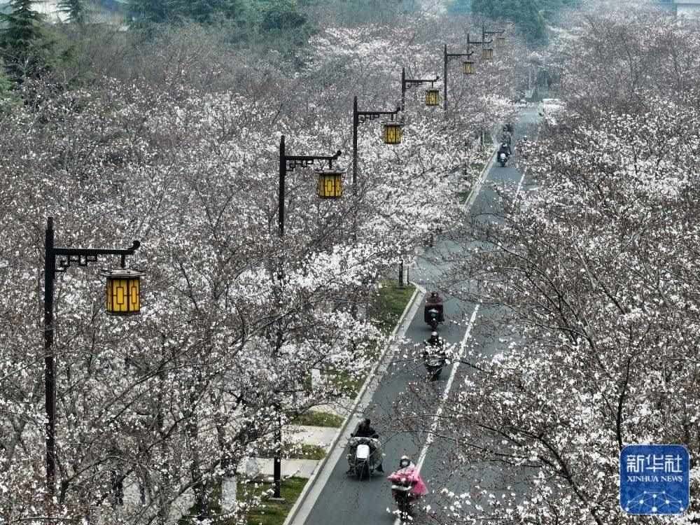 3月23日拍攝的江蘇省揚(yáng)州市鑒真路的“櫻花大道”景色(無人機(jī)照片)。新華社發(fā)(孟德龍攝)