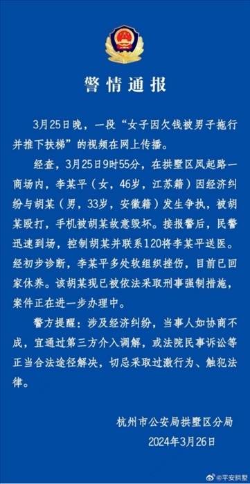 ·杭州拱墅警方通報(bào)女子被拖行推下扶梯:因經(jīng)濟(jì)糾紛起爭執(zhí),男子被依法采取刑事強(qiáng)制措施。