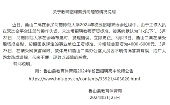·河南官方通報(bào):高中教師招聘薪資1000以下系操作失誤。