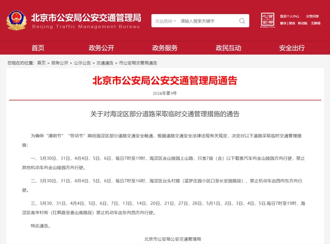 央視網(wǎng)消息:據(jù)北京市公安局公安交通管理局消息,3月26日,北京市交管局網(wǎng)站發(fā)布《關(guān)于對(duì)海淀區(qū)部分道路采取臨時(shí)交通管理措施的通告》,為確?!扒迕鞴?jié)”“勞動(dòng)節(jié)”期間海淀區(qū)部分道路交通安全暢通,根據(jù)道路交通安全法律法規(guī)有關(guān)規(guī)定,決定對(duì)以下道路采取臨時(shí)交通管理措施。