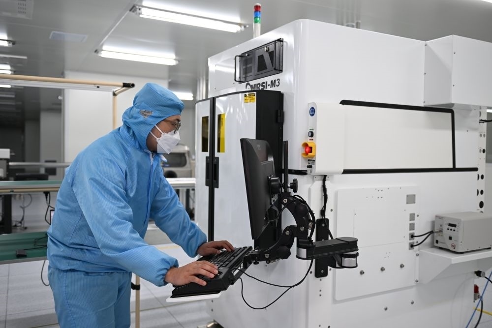 ↑3月28日,在雄安科創(chuàng)中心中試基地,芯聯(lián)新(河北雄安)科技有限公司工作人員在調(diào)試芯片生產(chǎn)設備。