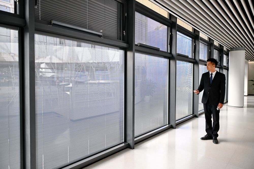 ↑3月28日,雄安自貿(mào)試驗區(qū)交流展示中心的工作人員在展示兼具保溫與遮陽效果的鍍膜玻璃,該中心是首批通過新區(qū)專家評審的零碳示范建筑。