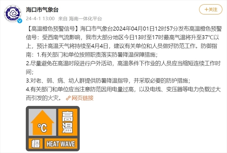 央視網消息:據@??谑袣庀笈_ 微博消息,??谑袣庀笈_2024年04月01日12時57分發(fā)布高溫橙色預警信號:受西南氣流影響,??谑写蟛糠值貐^(qū)今日13時至17時最高氣溫將升至37℃以上,預計高溫天氣將持續(xù)至4月4日,建議有關單位和人員做好防范工作。